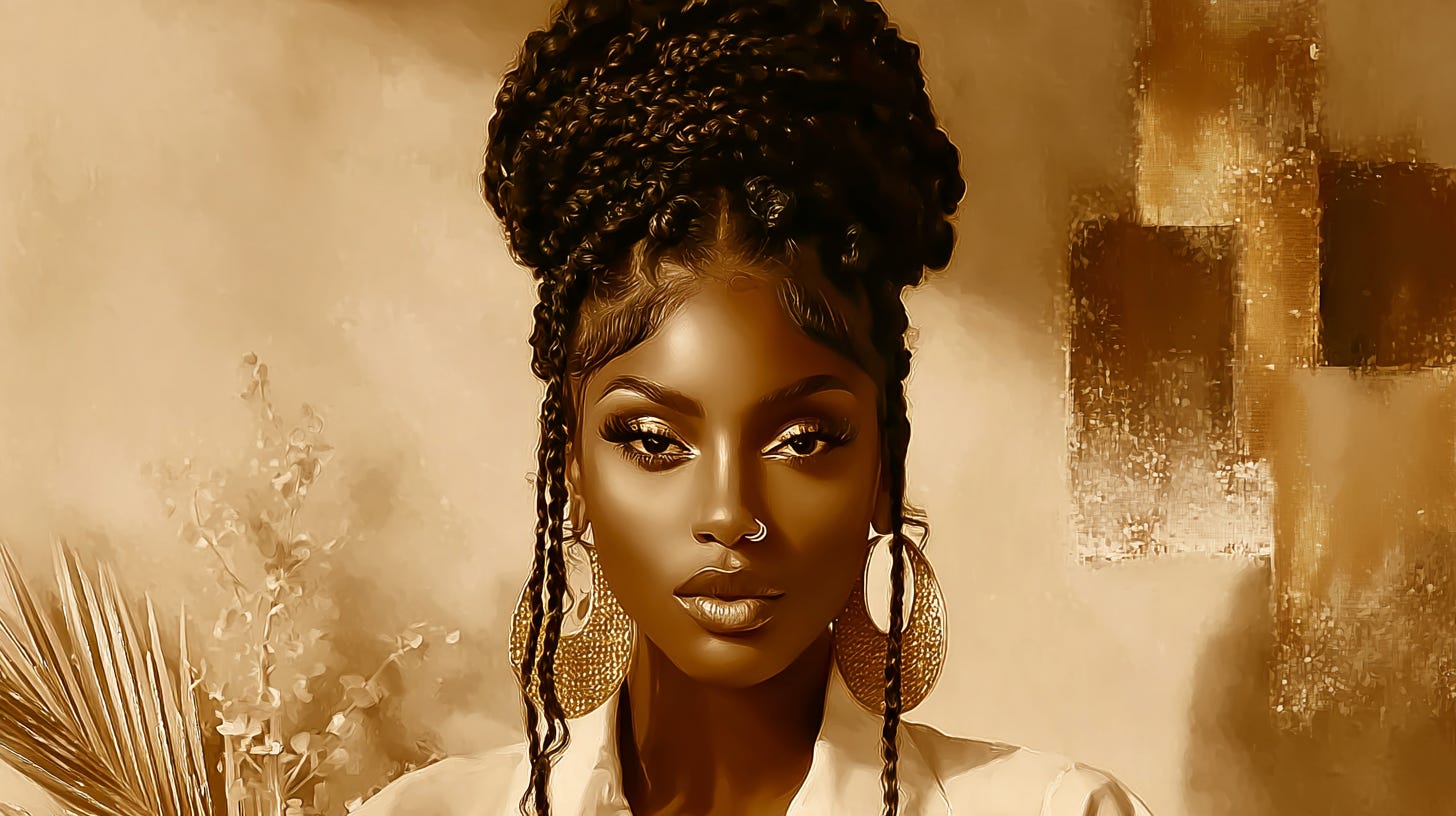 A portrait of an african american woman with short hair, wearing modern jewelry and dark. she is looking directly at the camera in front of a dimly lit background. the lighting casts dramatic shadows on her face, adding to her mysterious aura. her expression exudes confidence and strength as she stands against the backdrop of a high-end fashion studio, in the style of canon eos r5.