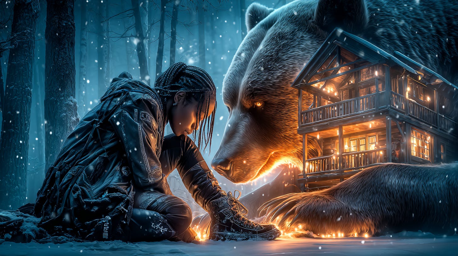 Snow resting on dark branches, the sky soft with fading light. In the centre of the scene stands a small wooden cabin glowing warmly from within. Outside the cabin, a powerful black bear rests peacefully beside me, curled in calm stillness.