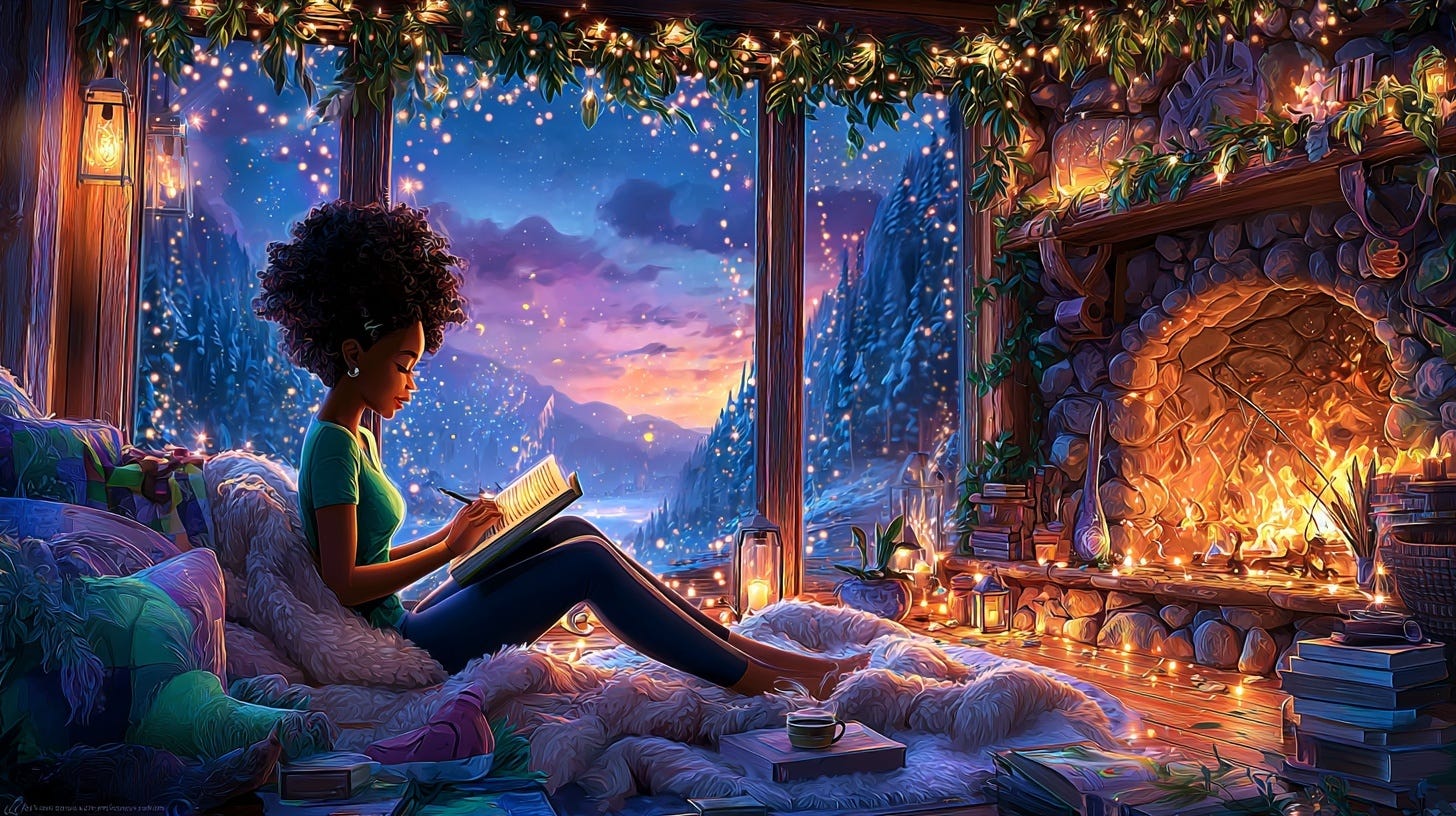 A [ethnicity] woman in cozy attire sits by the fireplace, surrounded by fluffy blankets and books, with warm light from fairy lights illuminating her face as she reads next to an open window overlooking nature outside. the room is decorated for christmas, featuring garlands of greenery hanging above a stone chimney. in front of it stand tall windows covered in twinkling stars that glow through a misty night sky. a soft pastel color scheme adds warmth to this picturesque scene.
