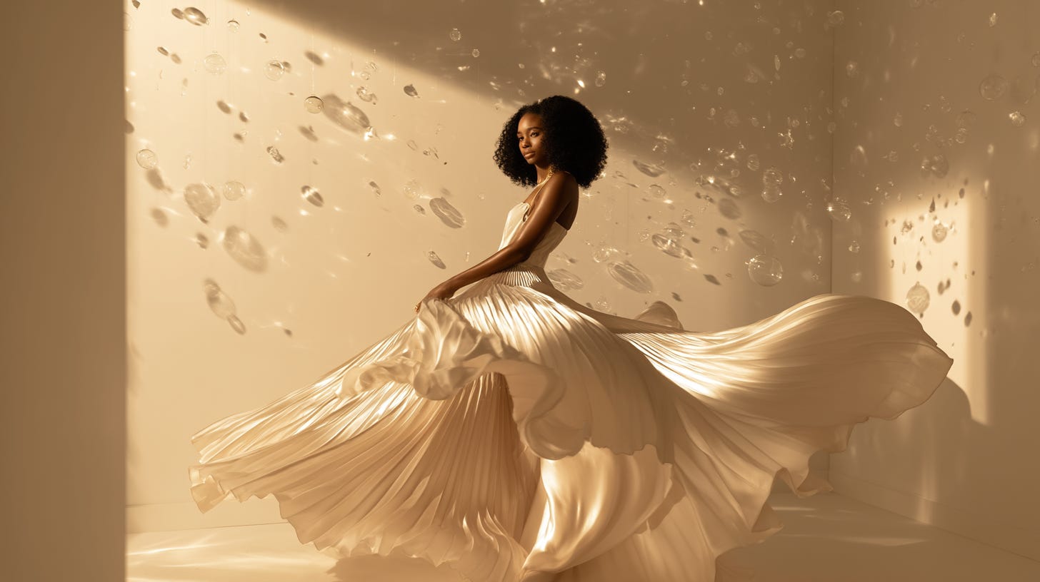 A radiant Black woman standing in a softly lit, sun-drenched room, wearing a flowing silk gown in warm cream and deep navy tones, subtle gold jewellery catching the light, surrounded by delicate glass ornaments and crystals reflecting sunlight across the walls, cinematic editorial style, bright and uplifting atmosphere, clean composition, luxurious textures, designed to feel like wall art or a journal cover, high detail, soft glow, calm and powerful presence